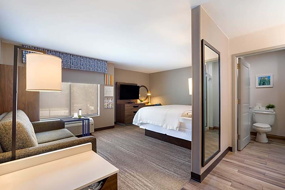 Pull-down bed, 46-inch HD TV, work desk, microwave, refrigerator, coffeemaker, free WiFi Enjoy a restful stay in this comfortable room with a king-sized clean and fresh Hampton bed® plus a pull-down queen bed, an easy chair and a 46-inch TV with HD channels. This room also features a large work desk, a microwave, mini-refrigerator and a coffeemaker. Free WiFi access will help you to stay connected when on the road. The bathroom contains plush towels and a shower featuring a curved shower rod for added space and light.